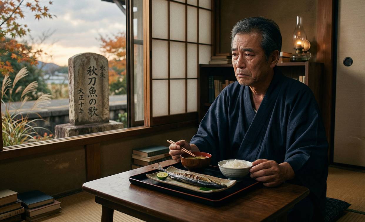 秋刀魚を食べながら涙を流す男。秋風に向かって、その孤独を伝えてほしいと訴える詩。庶民の食べ物を詠んだ、叙情的な秋の詩——と読めば、そう読める。しかしこの詩には、背景がある。